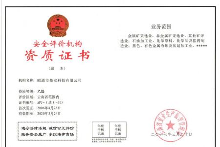 2003年11月10日,昭通市鼎安科技有限公司成立,初始主要從事第三方安全工程技術(shù)服務(wù),經(jīng)多年運營,發(fā)展為多專業(yè)綜合科技平臺,為社會提供多種專業(yè)技術(shù)服務(wù)工作。 現(xiàn)公司注冊資金為1200萬元,公司法定代表人:毛衛(wèi)旭。公司主要業(yè)務(wù):安全評價、安全標準化評審、安全工程技術(shù)服務(wù);環(huán)境監(jiān)測、職業(yè)衛(wèi)生檢測、檢驗;法律訴訟及非訴訟服務(wù);司法鑒定、固定資產(chǎn)投資項目節(jié)能服務(wù);工程咨詢;工程測量測繪;安全教育培訓等。是安全生產(chǎn)服務(wù)、安全教育培訓機構(gòu),也是環(huán)境監(jiān)測和職業(yè)衛(wèi)生服務(wù)機構(gòu),同時也是綜合的檢測檢驗、綜合科技平臺服務(wù)機構(gòu)。多年來為公、檢、法、司、軍、警、海關(guān)、仲裁、安監(jiān)、工礦商貿(mào)企業(yè)、社會團體及個人提供多專業(yè)技術(shù)服務(wù)。